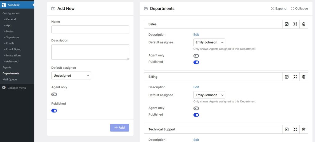 As soon as support requests come from more than one channel or team, structure matters. Sales questions, technical support, billing, and partner inquiries should not all land in one bucket. Awedesk has multi-inbox and departments as core features, which is useful for businesses with different support streams or teams.